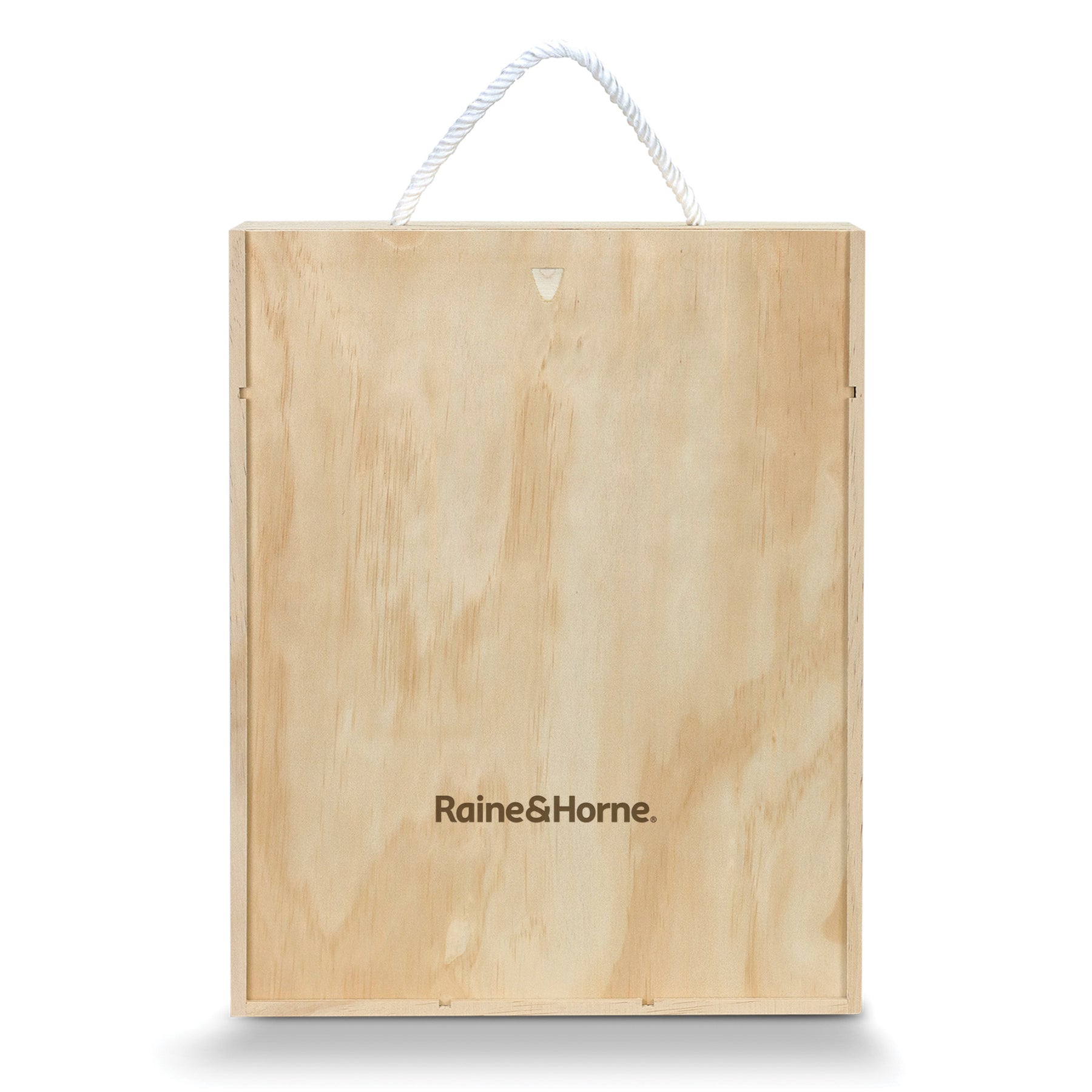 Elegant wine gift box made from natural pine wood with a sliding lid that offers a large branding area. The box is designed to hold three standard wine bottles and has built-in dividers with shredded paper filling. A woven cotton rope handle makes it easy and comfortable to carry.